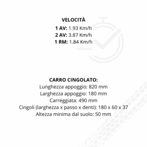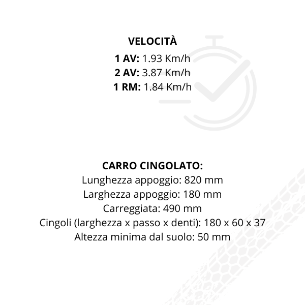 Lโavanzamento della macchina รจ su cingoli e la velocitร รจ variabile grazie al cambio meccanico a 2 marce avanti e 1 indietro. Tutto ciรฒ permette di avere sempre una perfetta stabilitร anche in pendenza permettendo allโoperatore un facile trasporto in qualsiasi situazione ambientale.’