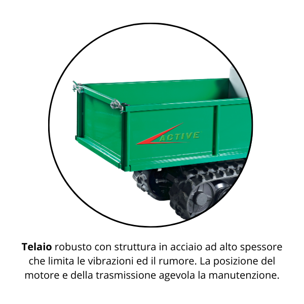 Il baricentro รจ basso per evitare che con le sollecitazioni del terreno il carico perda lโequilibrio. Il motore montato รจ un Honda GX160 a 4 tempi alimentato a benzina e con una cilindrata di 163 cc. Lโavviamento รจ a strappo tramite fune ed รจ facilitato grazie allโauto adescamento di carburante. Il motore lavora alla perfezione con il cambio a 3 marce e alla trasmissione resistente che riesce a gestire singolarmente entrambi i cingoli riuscendo a disattivare la rotazione per permettere alla macchina di girare con pochissimo angolo.